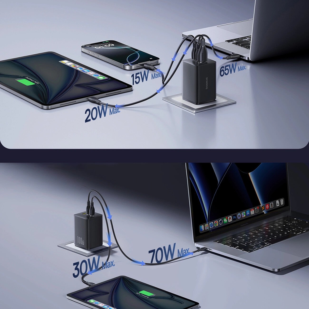Das Baseus EnerFill FE11 Ladegerät bietet eine maximale Leistung von bis zu 100 W, was ein schnelles Laden nicht nur von Smartphones oder Tablets, sondern auch von modernen Laptops mit USB-C-Port ermöglicht.