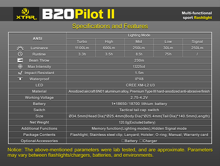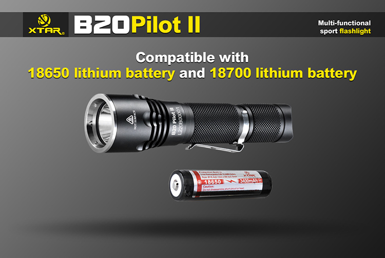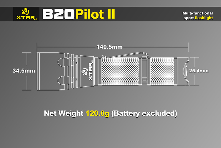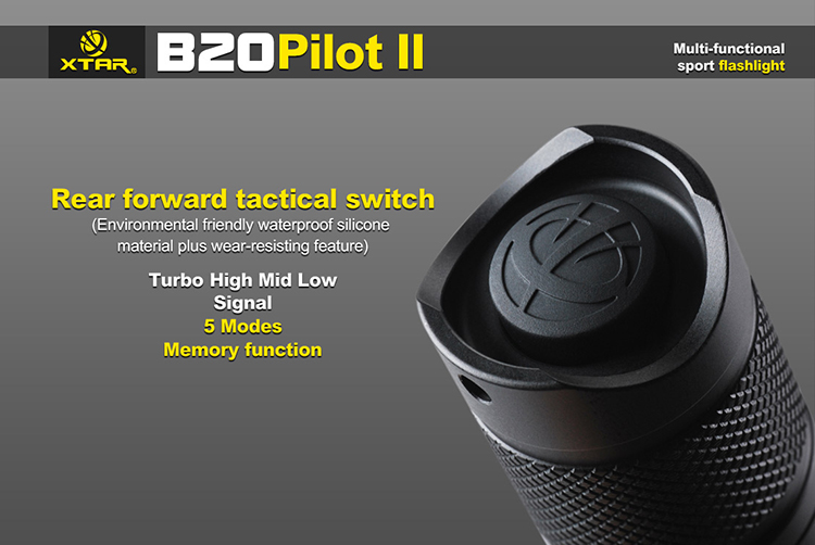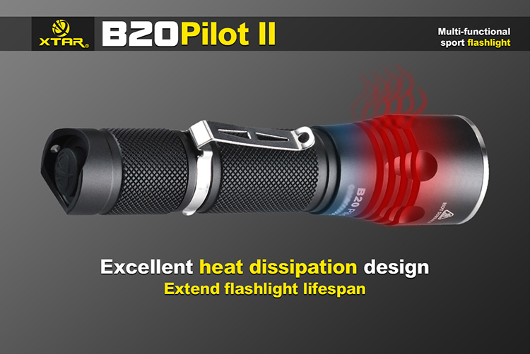 Xtar B20 Pilot II to wysokiej jakości kompaktowa latarka z oryginalną diodą Cree XM-L2 oferująca światło o mocy 1100 lumenów i zasięgu 230 metrów. Precyzyjnie wykończona, doskonale spasowana obudowa latarki B20została wykonana z wysokiej jakości stopu aluminium lotniczego 6N01 odpornym na upadki z wysokości 1,5m. Konstrukcja została uszczelniona o-ringami zapewniającymi stopień ochrony IPX8 (wodoszczelność do 1m). Wysokiej jakości kontakty i dwie sprężyny zapewniają bardzo dobry styk akumulatora i wysoką odporność na wstrząsy.