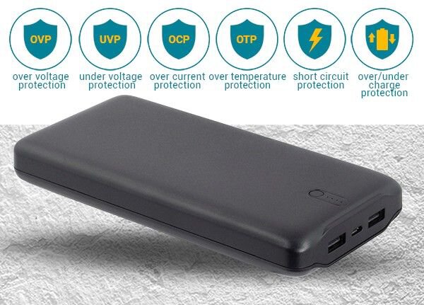 W power banku zadbano o bezpieczeństwo, wyposażając go w zespół zabezpieczeń: przed przeładowaniem, nadmiernym rozładowaniem, zwarciem i nadmiernym natężeniem prądu.