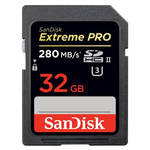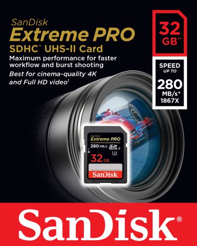 SanDisk SDHC 32GB Extreme PRO class UHS-II U3, class 10 prędkość zapisu: do 250 MB/s prędkość odczytu: do 280 MB/s |