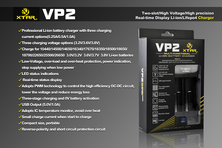 W niedużej obudowie ukryta jest w pełni profesjonalna procesorowa ładowarka z trzystopniowym procesem ładowania TC/CC/CV. Xtar VP2 Ładuje standardowe ogniwa Li-ion 3,6 / 3,7V oraz Li-ion o podwyższonym napięciu 3,8V a także akumulatory litowo-żelazowe (LiFePO4). Z wymienionych typów obsługiwane są akumulatory o dowolnej pojemności w rozmiarach 10440, 14500, 14650, 16340, 17500, 17670, 18350, 18500, 18650, 18700, 20700, 21700, 22650, 25500, 26650. Wyboru typu ogniwa dokonuje się przełącznikiem umieszczonym z tyłu obudowy a prąd ładowania ustala się przyciskiem na obudowie. Napięcie dla obu kanałów ładowania jest ustawiane wspólnie - w ładowanie nie można jednocześnie ładować ogniw o różnych napięciach nominalnych. Prąd ładowania również jest wspólny dla obu kanałów.