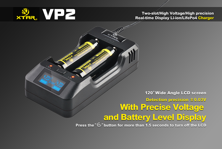 Xtar VP2 została wyposażona w wyświetlacz LCD informującym o prądzie ładowania, postępie ładowania i aktualnym napięciu akumulatorów. W kanałach nieużywanych wyświetlane jest aktualnie wybrane napięcie ładowania.