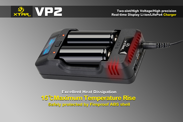 Ładowarki od innych producentów mogą znacząco podnosić temperaturę ładowanych ogniw podczas ładowania. Zbytnie nagrzewanie się ogniw może powodować ich szybsze zużycie. Projektując ładowarkę VP2, firma Xtar poszła o krok dalej od konkurencji, rozwiązując ten problem w prosty sposób: zastosowano zasilanie z zewnętrznego zasilacza. Dzięki temu temperatura ładowanego w VP2 akumulatorka wzrośnie najwyżej o 15 stopni.