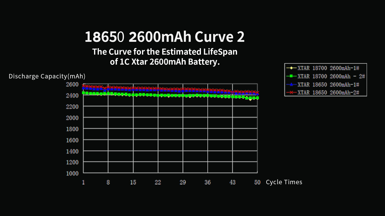 Xtar 18650 Lithium-Ionen-Batterie mit einer Kapazität von 2600 mAh. Geschützt vor Überladung, Überentladung, Überlastung und Kurzschluss.