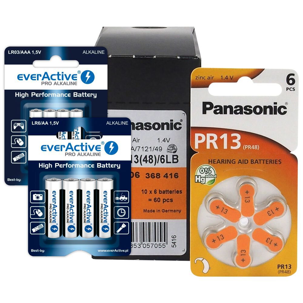 - Ilość: 60 sztuk baterii Panasonic, 4 sztuki LR6 / AA everActive Pro Alkaline, 4 sztuki LR03 / AAA everActive Pro Alkaline