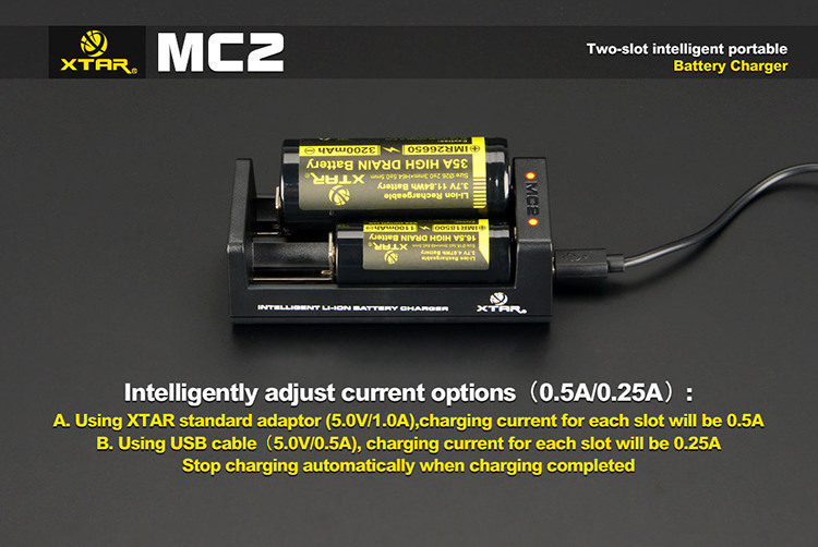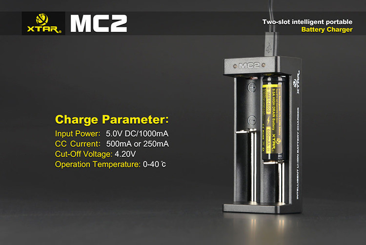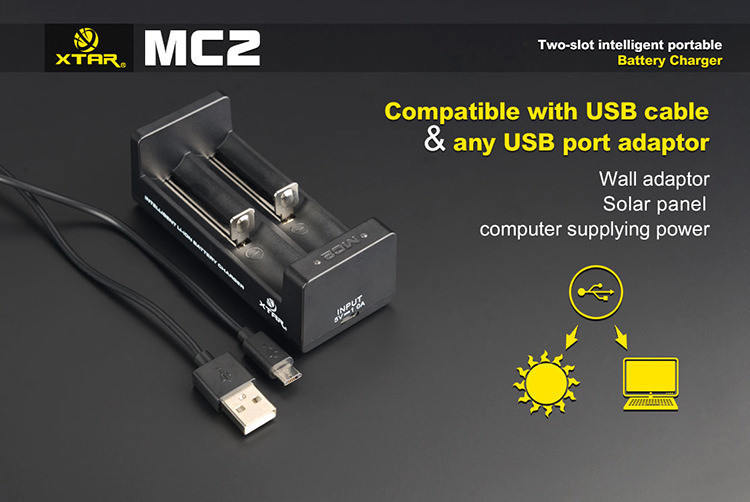 The Xtar MC2 charger comes with a micro USB cable and a cover to protect the charger for transport, as well as a 5V 1A USB power supply. To power the charger, any charger with a micro USB cable, e.g. from a phone, or a USB socket, or a computer with a free port, is enough