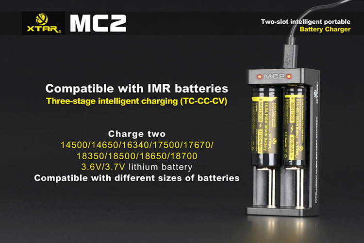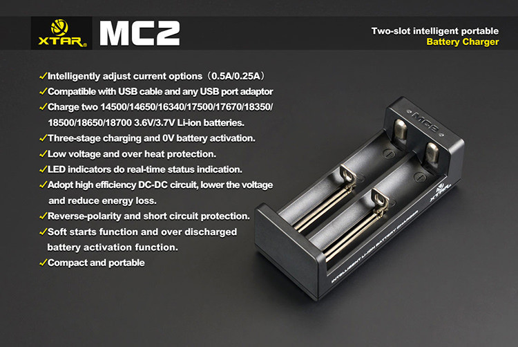 | Supported battery sizes | 10440, 14500, 14650, 16340, 17500,17670, 18350, 18500, 18650, 18700, 22650, 25500, 26650 |