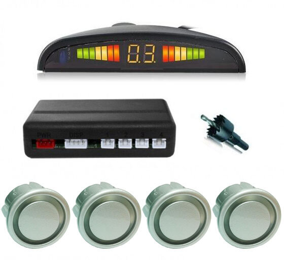 kompletny zestaw do montażu: 4 sensory w kolorze srebrnym, centralka sterująca, wyświetlacz LED na deskę rozdzielczą, otwornica + pełne okablowanie