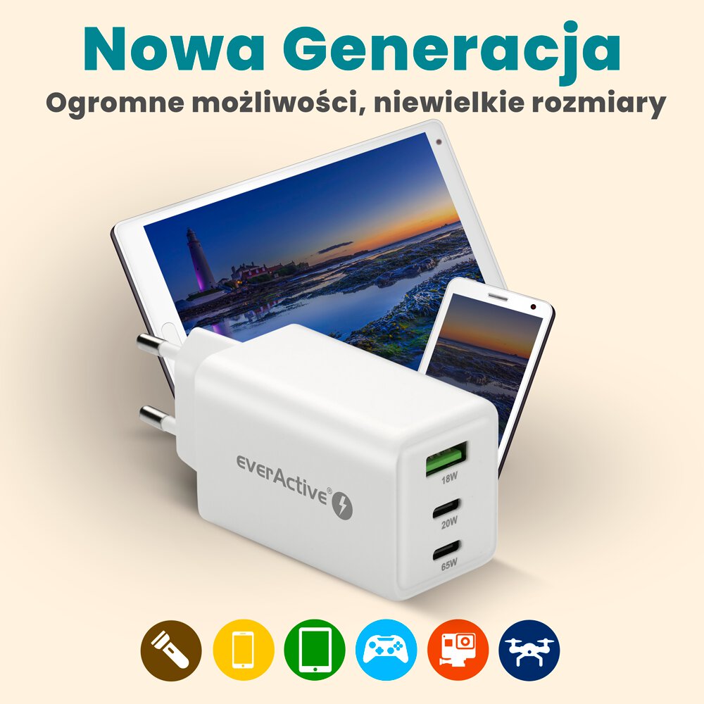 The everActive SC-655Q charger is compatible with all iPhones that support fast charging. It is also perfect for Android smartphones or tablets. You can also successfully use it in combination with, among other things, laptops, speakers, power banks, flashlights or desk lights. Support for fast charging protocols such as PD, PPS and QC4+ means that you can use this unique charger in almost any situation!