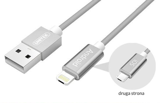 Unitek godzi ze sobą zwolenników telefonów opartych na Androidzie oraz wyznawców Apple. Jako pierwszy wypuszcza na rynek przewód, który w jednym konektorze posiada złącze Lightning oraz microUSB. Jakie to proste i jakie wygodne! Jeden przewód - dwa standardy. Obracasz wtyk stroną oznaczoną Android i podłączasz do telefonu z microUSB, obracasz wtyk stroną oznaczoną iOS i podłączasz do iPhona lub iPada. Przewód służy do ładowania i synchronizacji telefonów i tabletów.