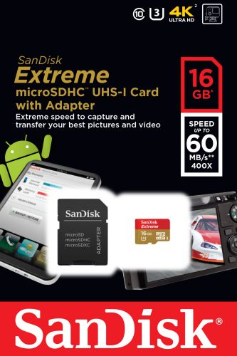 SanDisk microSDHC 16GB Extreme class UHS-I 3, class 10 prędkość odczytu: do 60 MB/s (400x) prędkość zapisu: do 40 MB/s (266x) osiągnięte parametry w testach własnych: prędkość odczytu: 75MB/s prędkość zapisu: 55MB/s |