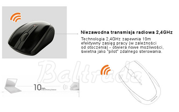 Mysz działa w niezależnym paśmie radiowym 2,4GHz - zdecydowanie szybszy czas reakcji, jak w przypadku rozwiązań Bluetooth - bardzo istotne dla gier komputerowych.