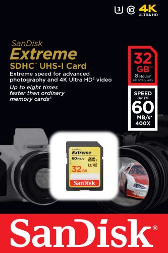 SanDisk SDHC 32GB Extreme 400x class UHS-I U3, class 10 prędkość zapisu: do 40 MB/s prędkość odczytu: do 60 MB/s osiągnięte parametry w testach własnych: prędkość zapisu: 54MB/s prędkość odczytu: 74MB/s |