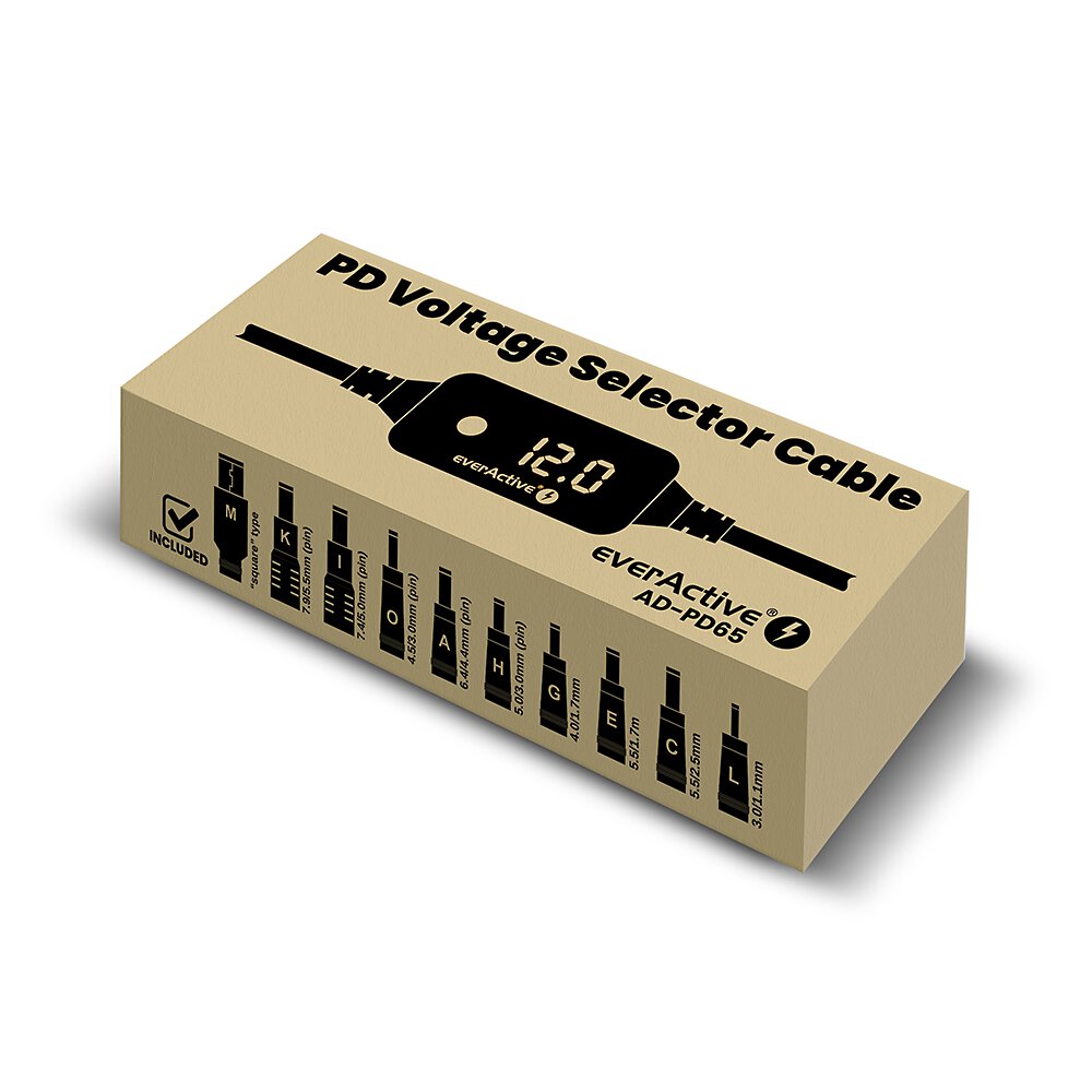 Universal Power Supply, Voltage Selector USB-C PD - DC 5V, 9V, 12V, 15V, 20V, 10 connectors, everActive AD-PD65