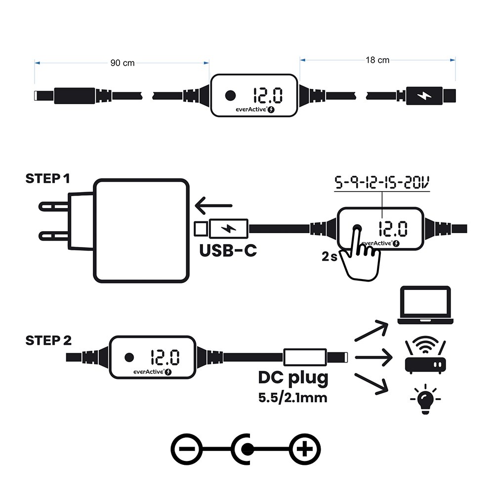 - Universal Power Supply, Voltage Selector USB-C PD - DC 5V, 9V, 12V, 15V, 20V everActive AD-PD65