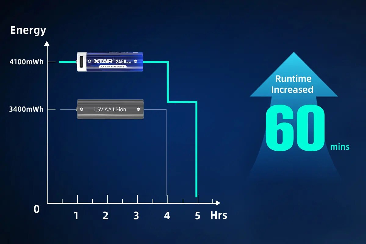 Extended runtime compared to other 1.5V Li-ion batteries on the market