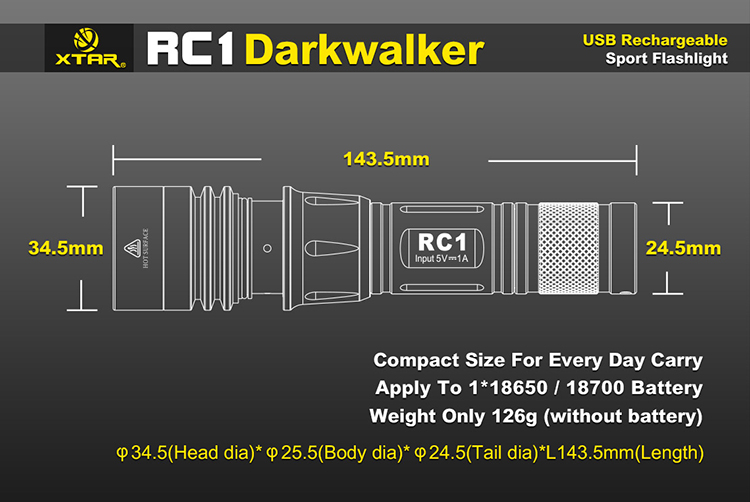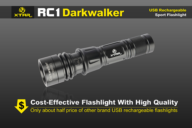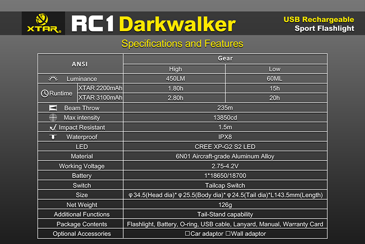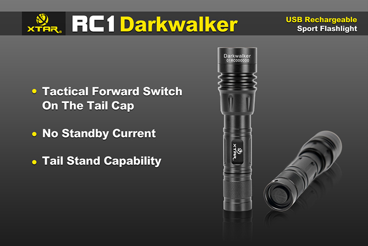The Xtar RC1 Darkwalker is a high-quality compact flashlight with an original Cree XP-G2 LED offering a light output of 450 lumens and a range of 235 meters. The precision-finished, perfectly fitted RC1 flashlight housing is made of high-quality 6N01 aircraft aluminum alloy resistant to drops from a height of 1.5m. The structure has been sealed in 4 places with O-rings providing IPX8 protection (water resistance up to 1m). High-quality contacts and two springs ensure very good battery contact and high shock resistance.