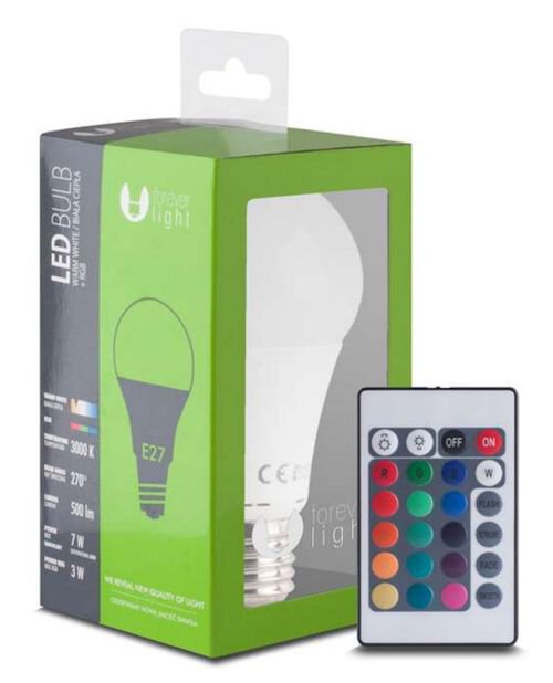 Żarówka A60 7W LED SMD + 3W LED RGB z przetwornicą RC i pilotem o trzonku E27 i napięciu 230V stanowi istotną konkurencję dla zwykłych żarówek. W prezentowanej żarówce, diody posiadają struktury do generowania czterech podstawowych barw (czerwony, zielony, niebieski, biały). Sterowana zdalnym pilotem na podczerwień z 24 przyciskami umożliwiającymi wybór 16 kolorów oraz funkcją ściemniania i rozjaśniania i 4 programami dynamicznymi.
