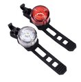 Zestaw lekkich syngalizacyjnych lamp rowerowych. Każda z lampek jest zasilana dwiema popularnymi bateriami litowymi w rozmiarze CR2032. Baterie dołączone do zestawu.