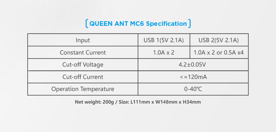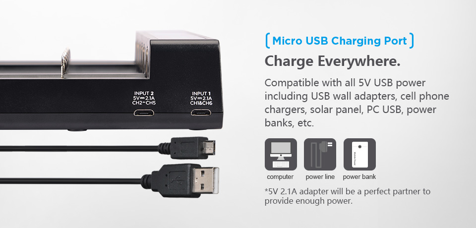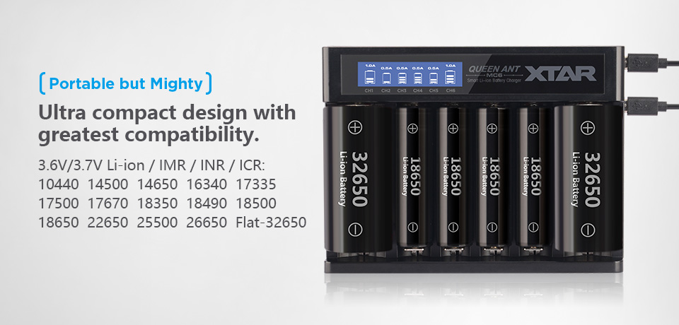 W niewielkiej obudowie ukryta jest w pełni profesjonalna procesorowa ładowarka z trzystopniowym procesem ładowania TC/CC/CV. Ładuje 1-6 ogniwa Li-ion 3,6 / 3,7V o dowolnej pojemności w rozmiarach 14500, 14650, 16340, 17500, 17670, 18350, 18500, 18650, 18700. Możliwe jest również ładowanie dwóch akumulatorów o rozmiarze 20700, 21700, 22650, 25500 lub 26650.