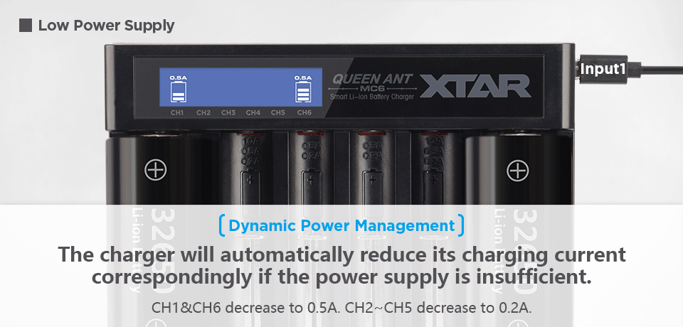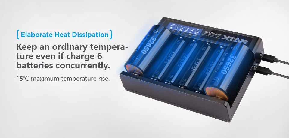 Ładowarki od innych producentów mogą znacząco podnosić temperaturę ładowanych ogniw podczas ładowania. Zbytnie nagrzewanie się ogniw może powodować ich szybsze zużycie. Projektując ładowarkę MC6, firma Xtar poszła o krok dalej od konkurencji, rozwiązując ten problem w prosty sposób: zastosowano zasilanie z zewnętrznego zasilacza. Dzięki temu temperatura ładowanego w MC6 akumulatorka wzrośnie najwyżej o 15 stopni.