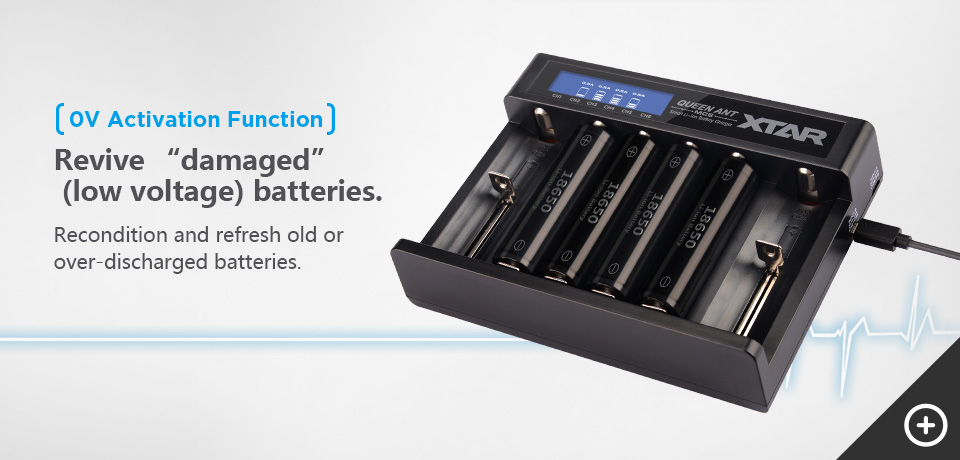 Ładowarka Xtar MC6 posiada funkcję reaktywacji ogniw głęboko rozładowanych i ogniw o napięciu 0V. Wiele ładowarek na rynku nie jest w stanie naładować takich akumulatorów. Tutaj z pomocą przychodzi ładowarka Xtar MC6, która w wielu przypadkach pozwala na 'odratowanie' takich ogniw. Wystarczy włożyć głęboko rozładowany akumulator do ładowarki MC6, tak jak przy normalnym ładowaniu - ładowarka wykryje rozładowane ogniwo i podejmie próbę jego reaktywacji. Uwaga! Ogniwa rozładowane poniżej pewnego poziomu ulegają nieodwracalnemu uszkodzeniu i ich reaktywacja może być niemożliwa. Należy unikać zbyt głębokiego rozładowania akumulatorów Li-ion - może to doprowadzić do znacznego obniżenia ich trwałości i pojemności lub doprowadzić do ich całkowitej niesprawności.