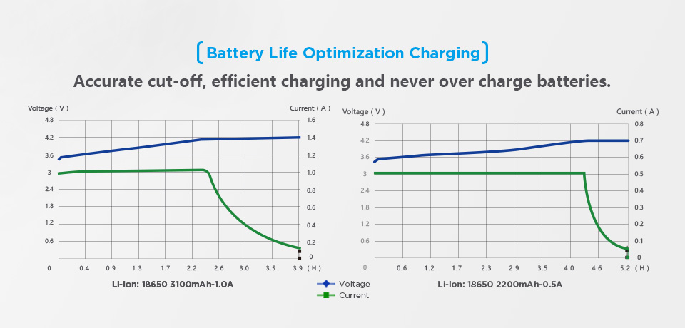 Akumulatory o napięciu 4,06V lub wyższym są traktowane przez ładowarkę jako naładowane. Aby doładować taki akumulator do pełna należy włożyć go do ładowarki przed włączeniem jej do zasilania. Pozostawione w ładowarce naładowane akumulatory będą ulegały naturalnemu procesowi samorozładowania. Ładowanie zostanie wznowione gdy napięcie na akumulatorze spadnie poniżej 4,06V.