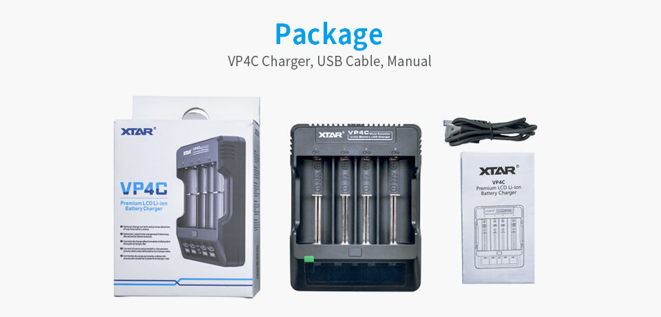 Profesjonalna procesorowa ładowarka z trzystopniowym procesem ładowania TC/CC/CV. Xtar VP4C ładuje standardowe ogniwa Li-ion 3,6 / 3,7V w rozmiarach 10440, 14500, 14650, 16340, 17500, 17670, 18350, 18500, 18650, 18700, 20700, 21700 - tylko niezabezpieczone, 22650, 25500, 26650, 32650. Akumulatory o największych rozmiarach, tj, 22650, 26650 i 32650 można ładować tylko w dwóch skrajnych kanałach.