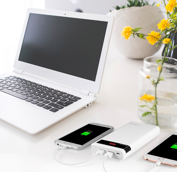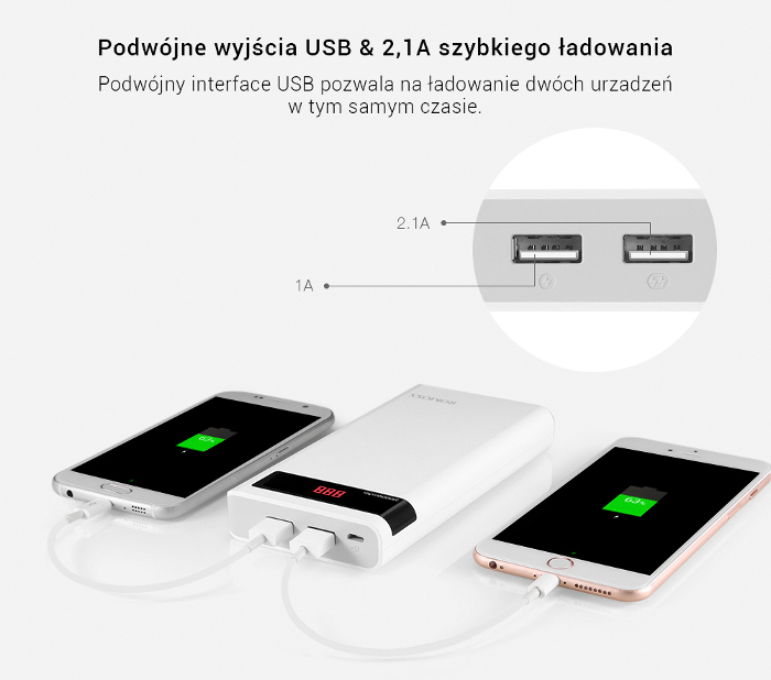 Komponent Dual-output - równoczesne ładowanie 2 urządzeń przenośnych podłaczonych do baterii zewnętrznej Romoss.