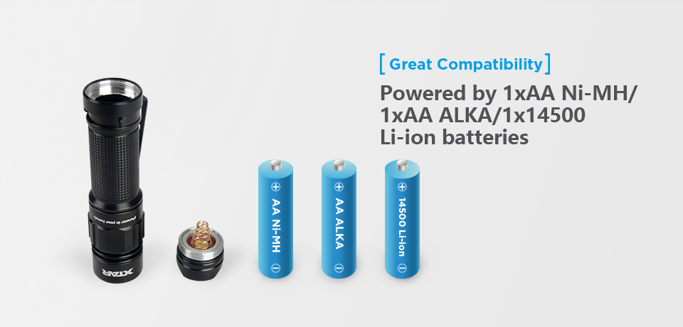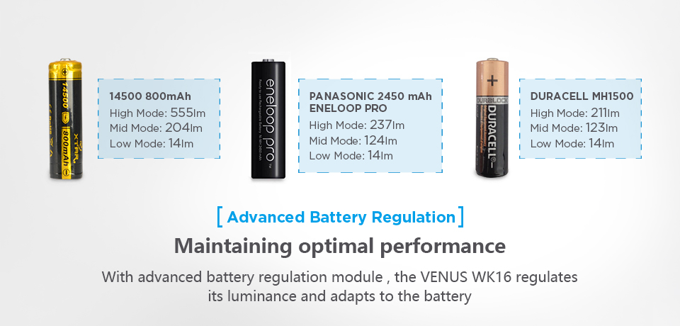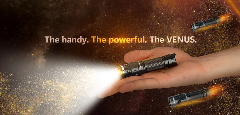Latarkę Venus można zasilić jednym litowo-jonowym akumulatorem o rozmiarze 14500, akumulatorem Ni-MH AA/R6 lub baterią alkaliczną AA/LR6. Baterie i akumulatory nie zostały dołączone do zestawu.