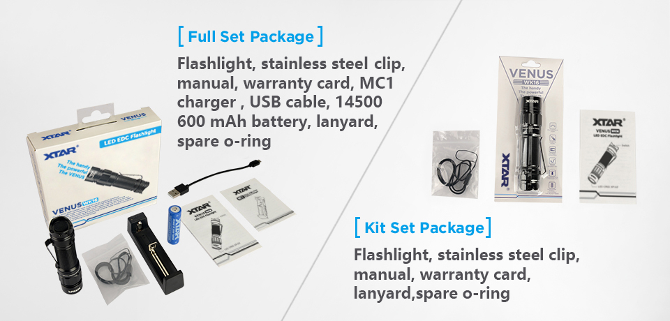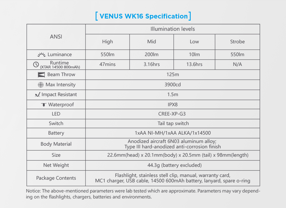 Xtar WK16 Venus to wysokiej jakości kompaktowa latarka z oryginalną diodą Cree XP-G3 oferująca światło o mocy 550 lumenów i zasięgu 125 metrów. Precyzyjnie wykończona, doskonale spasowana obudowa latarki WK16 została wykonana z wysokiej jakości stopu aluminium lotniczego 6N01 odpornego na upadki z wysokości 1,5m. Konstrukcja została uszczelniona w o-ringami zapewniającymi stopień ochrony IPX8 (wodoszczelność do 1m). Wysokiej jakości kontakty i dwie sprężyny zapewniają bardzo dobry styk akumulatora i wysoką odporność na wstrząsy.