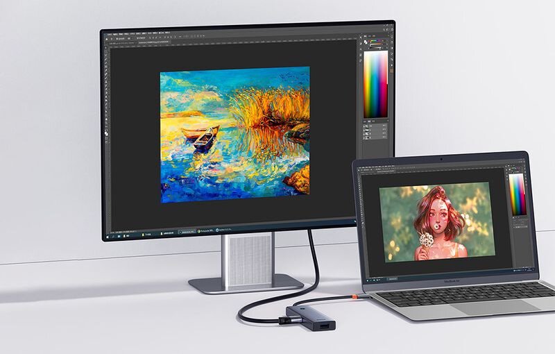 Dank des HDMI-Anschlusses können Sie den Laptop-Bildschirm auf einem Monitor, Projektor oder Fernseher erweitern oder duplizieren. Der Hub unterstützt eine Auflösung von bis zu 4K (3840 × 2160), was ihn ideal für Büroarbeiten, Präsentationen oder das Ansehen von Filmen macht.