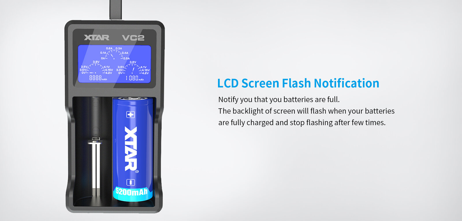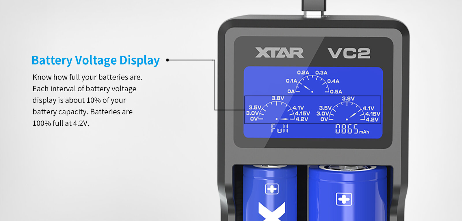 Das beleuchtete LCD-Display des Ladegeräts Xtar VC2 zeigt kontinuierlich Informationen über den Betriebszustand des Ladegeräts an: die Spannung der geladenen Akkus, den Ladestrom, die zur Aufladung der Zellen verwendete Ladung, zeigt eventuelle Fehler an und informiert über das Ende des Ladevorgangs. Die Information über die verwendete Ladung kann zur Messung der Kapazität der Akkus verwendet werden. Um die Kapazität eines Akkus zu messen, muss dieser auf den für ihn geeigneten Entladepegel (meistens 2,5V) entladen und in das Ladegerät VC2 eingelegt werden. Nach Abschluss des Ladevorgangs kann vom Display der Wert der zur Aufladung des Akkus verwendeten Ladung abgelesen werden. Dies wird immer ein Wert sein, der 3-5% höher ist als die tatsächliche Kapazität des Akkus. Dies liegt daran, dass der Ladevorgang von Akkus niemals zu 100% effizient ist, d.h. zum Laden des Akkus wird etwas mehr Ladung benötigt, als sich aus der tatsächlichen Kapazität der Zelle ergibt.