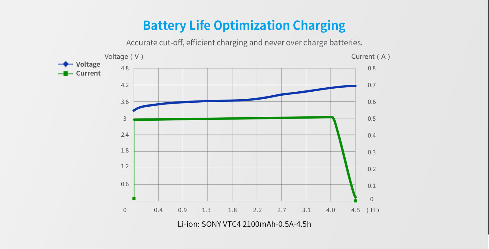 • Phase CV: Wenn die Zelle fast vollständig geladen ist, wechselt das Ladegerät auf das Laden mit abnehmendem Strom, bis eine Spannung von 4,2V an der Zelle erreicht wird. Nach Erreichen von 4,2V ist der Ladevorgang abgeschlossen - der Akku ist vollständig geladen.