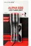 The Alpha 500 is a compact handheld flashlight powered by three AAA batteries. It has a focal length adjustment (Focus) that allows you to switch between wide light for illuminating larger areas and a focused spot beam.