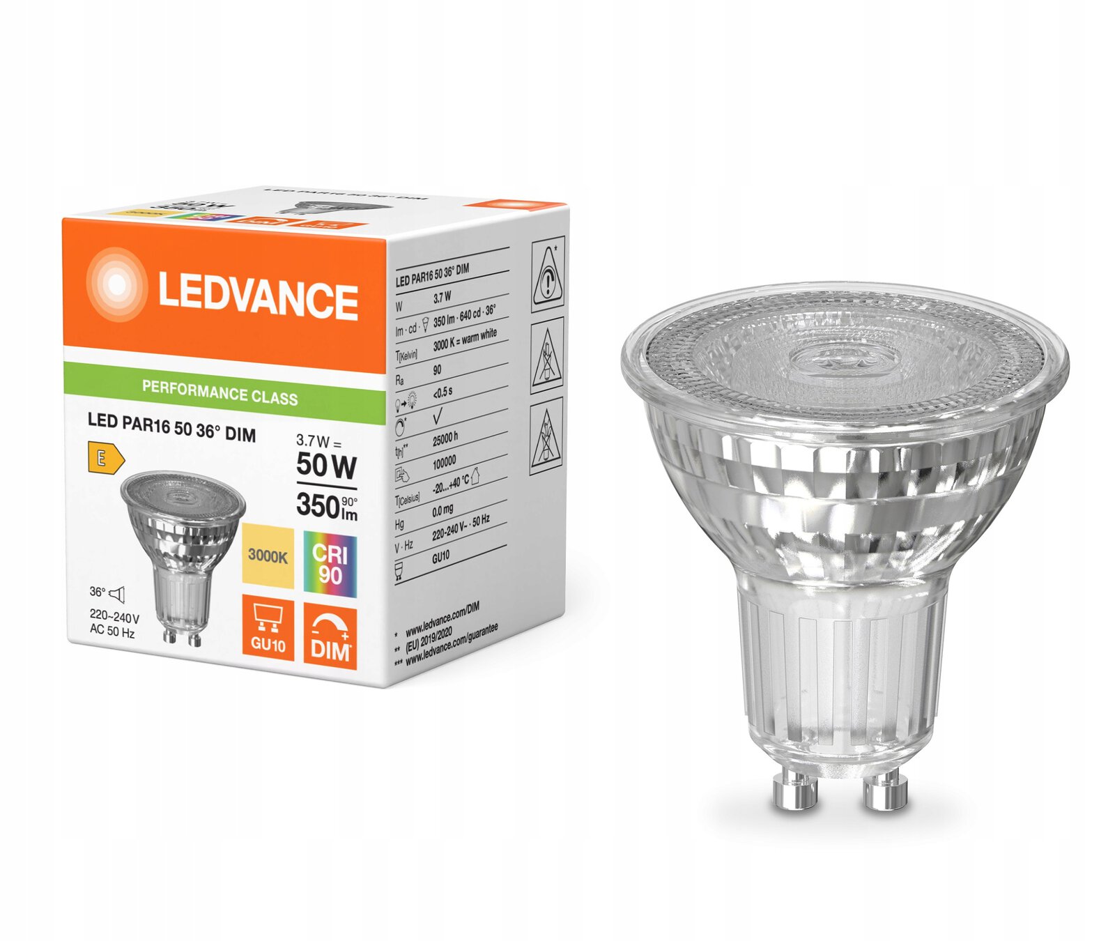 The Osram LED spotlight is an energy-saving PAR16 bulb with a GU10 stem, ideal for spot and accent lighting in homes and commercial facilities. The product has a power of 3.7 W, which corresponds to a traditional light bulb with a power of about 50 W, with significantly lower power consumption. The luminous flux is 350 lumens and the light color is 3000 K warm white, which provides pleasant, natural interior lighting.