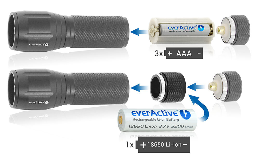 FL-300+ to bezkompromisowa latarka spod brandu everActive. Maksymalna siła światła na poziomie 350 lumenów (z ogniw AAA/R03), a nawet 550 lumenów (przy użyciu opcjonalnego adaptera i ogniwa 18650 Li-ion) i zasięgu 250 metrów powodują, że FL-300+ doskonale się sprawdzi przy codziennym jak i okazjonalnym użytkowaniu. Siła światła jest w zupełności wystarczająca do komfortowego poruszania się w całkowitych ciemnościach. Dostępny jest również oszczędniejszy tryb pracy na okazje nie wymagające tak dużej ilości światła.