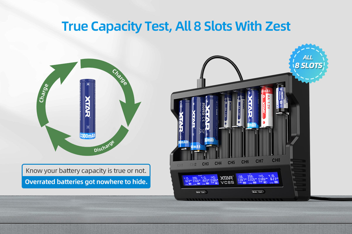 Le chargeur Xtar VC8S a la fonction de réactiver les cellules et cellules profondément déchargées avec une tension de 0V. De nombreux chargeurs sur le marché ne peuvent pas recharger ce type de batteries. C’est là que le chargeur Xtar VC8S intervient à la rescousse, ce qui permet souvent de « sauvegarder » ces cellules. Il suffit d’insérer la batterie profondément déchargée dans le chargeur VC8S comme vous le feriez avec une charge normale – le chargeur détectera la cellule déchargée et tentera de la réactiver.