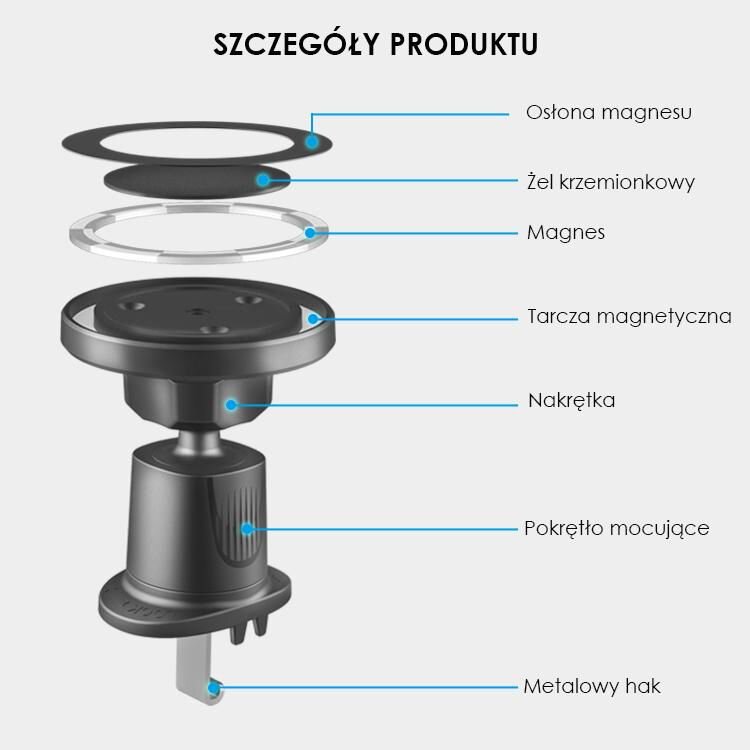 Specjalnie zaprojektowany haczyk, który spełnia rolę kotwicy blokując uchwyt o kratkę nawiewu.